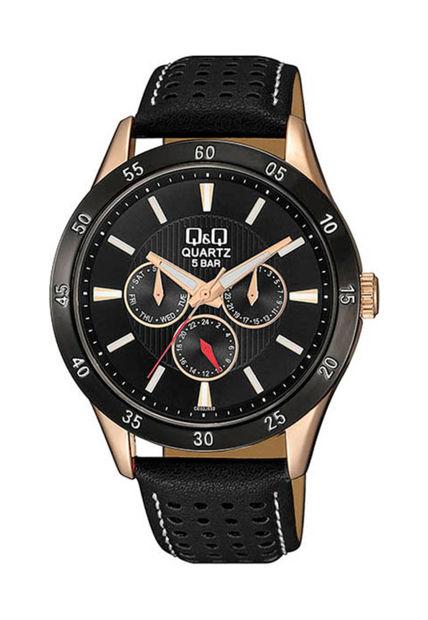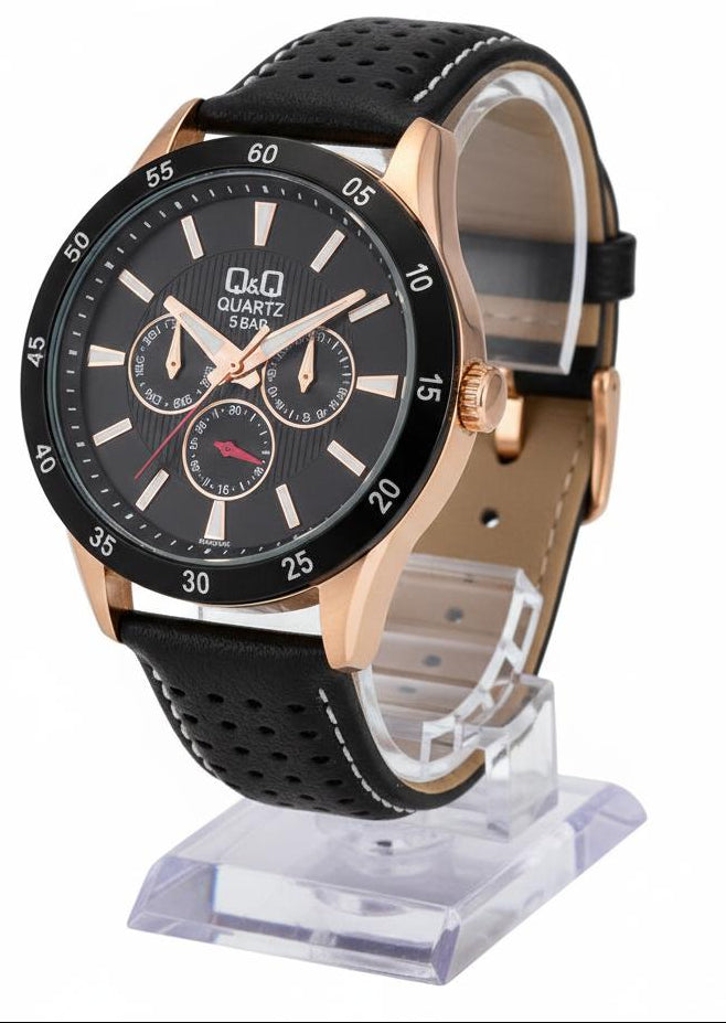 Reloj Q&Q Multifunción para Hombre - Dial Negro Texturizado y Oro Rosa - Correa de Cuero Perforada - Cuarzo Japonés - Estilo Deportivo de Lujo