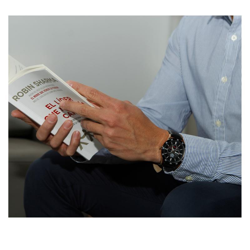 Sus subesferas funcionales y el segundero en color rojo deportivo no solo añaden utilidad, sino que inyectan un carácter audaz a la pieza. La correa de cuero sintetico negro con perforaciones estilo "racing" garantiza comodidad y una ventilación superior, ideal para un estilo de vida activo sin sacrificar el buen gusto.