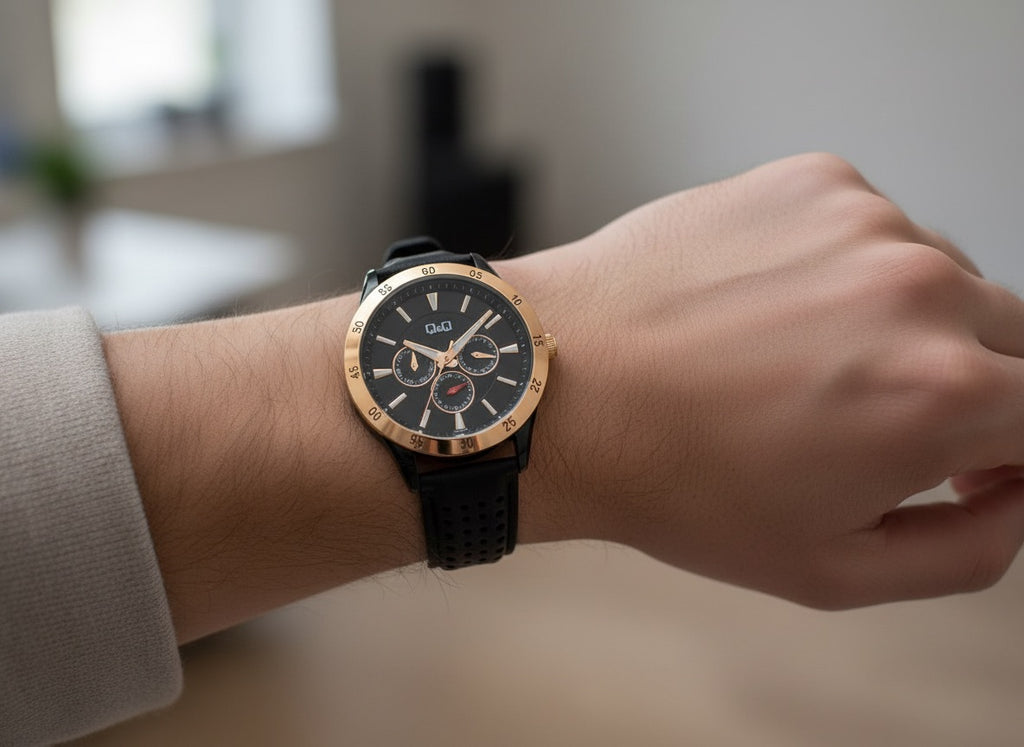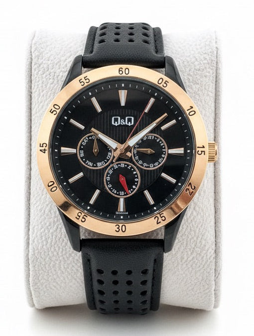 Eleva tu presencia con este imponente reloj Q&Q Multifunción. Diseñado para el hombre que busca un equilibrio entre la elegancia clásica y el dinamismo deportivo, este modelo destaca por su sofisticada caja en tono oro rosa que enmarca un dial negro profundo con texturas lineales de alta definición.