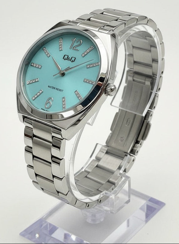 Elegancia vibrante para cada momento. Este reloj Q&Q redefine el concepto de accesorio funcional convirtiéndolo en una pieza de estilo. Con su llamativa esfera en color azul turquesa, este modelo captura la luz y las miradas, ofreciendo un look sofisticado que recuerda a las marcas de alta gama pero con la durabilidad y accesibilidad que caracteriza a Q&Q (subsidiaria de Citizen Watch Co.).